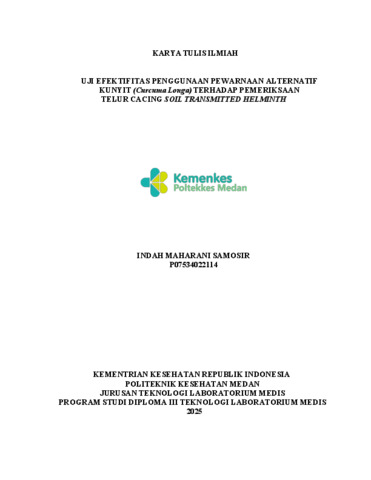 Samosir, Indah Maharani (2025) UJI EFEKTIFITAS PENGGUNAAN PEWARNAAN ALTERNATIF KUNYIT (Curcuma Longa) TERHADAP PEMERIKSAAN TELUR CACING SOIL TRANSMITTED HELMINTH. Diploma thesis, Poltekkes Kemenkes Medan.