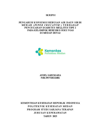 Sarumaha, Ansel (2025) Pengaruh Konsumsi Rebusan Air Daun Sirih Merah ( P I P E R C R O C A T U M )Terhadap Pencegahan Diabetes Mellitus Tipe 2 Pada Kelompok Beresiko Suku Nias Di Medan Denai. Diploma thesis, Poltekkes Kemnkes Medan.