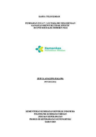 Jesyca Analisva, Halawa (2025) Penerapan Breast Care Pada Ibu Nifas Dengan Gangguan Menyusui Tidak Efektif Di UPTD RSUD dr.M.Thomsen Nias. Diploma thesis, Poltekkes Kemenkes Medan.