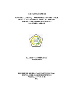 Zega, Rachel Yusnaria (2023) PEMERIKSAAN HBsAg – RAPID SCREENING TES UNTUK DETEKSI DINI HEPATITIS B PADA MAHASISWA TEKNOLOGI LABORATORIUM MEDIS POLTEKKES MEDAN. Diploma thesis, Poltekkes Kemenkes Medan.