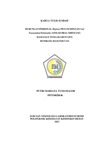 Tumanggor, Putri Mariana (2023) HUBUNGAN PERSONAL Higiene PETANI DENGAN Soil Transmitted Helminths (STH) DI DESA SIHOTANG HASUGIAN TONGAKABUPATEN HUMBANG HASUNDUTAN. Diploma thesis, Poltekkes Kemenkes Medan.