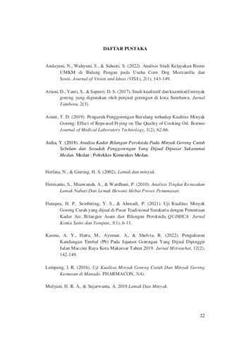 Awalia Rizky, Nurfadillah (2023) ANALISA BILANGAN PENYABUNAN PADA MINYAK G O R E N G C U R A H S E B E L U M D A N S E S U D A H PENGGORENGAN CORNDOG MOZARELLA YANG DIPERJUALBELIKANDI PASAR MMTC KOTA MEDAN. Diploma thesis, Poltekkes Kemenkes Medan.