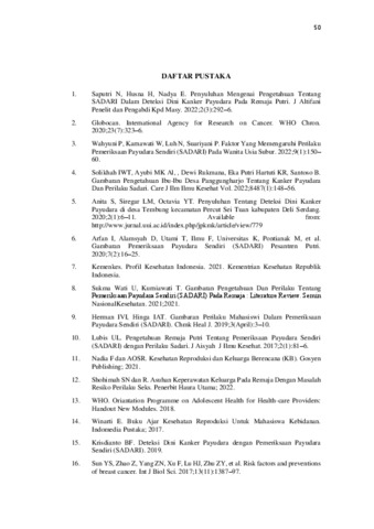 putri berdasarkan sumber informasi yaitu pengetahuan cukup sebanyak 3 orang (60,0%) dan pengetahuan kurang 2 orang (40,0%) yang diperoleh dari keluarga/orangtua. Untuk peneliti selanjutnya diharapkan dapat menambahkan variabel penelitian menggunakan buku saku supaya remaja putri lebih memahami tentang SADARI.