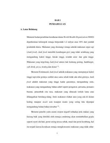 mengkonsumsi junk food yang diperoleh dari media massa 35,0%. Hasil penelitian juga menunjukkan kebiasaan mengkonsumsi junk food dalam kategori cukup sebanyak 73,3% dan tidak ada remaja yang tidak pernah mengkonsumsi makanan cepat saji. Kesimpulan : Dari hasil penelitian dapat disimpulkan bahwa siswa di SMA Negeri 1 namorambe masih banyak mengkonsumsi junk food sebesar 73,3%. Peran sekolah juga sangat penting dalam menyediakan kantin