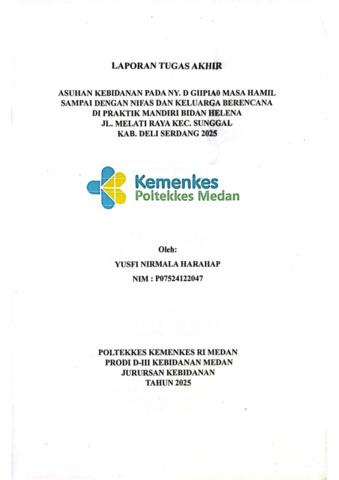 Harahap, Yusfi Nirmala (2025) Asuhan Kebidanan pada Ny. D GIIPIA0 Masa Hamil Sampai Dengan Nifas dan Keluarga Berencana di Praktik Mandiri Bidan Helena Jl. Melati Raya Kec. Sunggal Kab. Deli Serdang 2025. Diploma thesis, Poltekkes Kemenkes Medan.