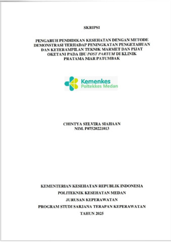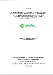Siahaan, Chintya Selvira (2025) Pengaruh Pendidikan Kesehatan Dengan metode demonstrasi Terhadap peningkatan Pengetahuan dan Keterampilan Teknik Marmet dan Pijat Oketani pada Ibu Post Partum Di Klinik Paratama Niar Patumbak. Diploma thesis, Poltekkes Kemnkes Medan.