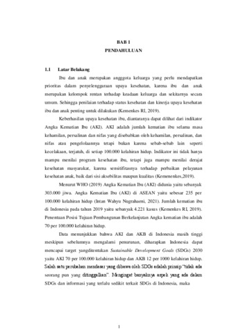 Berdasarkan WHO 2019 AKI di dunia tahun 2018 sebesar 239 per 100.000 Kelahiran Hidup. Hasil Survei Demografi dan Kesehatan Indonesia ( SDKI) tahun 2019, AKI 359 per