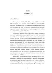 Angka Kematian Ibu dan Bayi di Indonesia Masih merupakan masalah yang dapat dinilai melalui indikator utama Angk Kematian Ibu (AKI). Kematian Ibu dalam indikator ini didefinisikan sebagai semua kematian selama periode kehamilan, persalinan, dan nifas yang disebabkan oleh kehamilan, persalinan, dan nifas atau pengelolaannya tetapi bukan karena sebab lain seperti kecelakaan atau insidental. Angka Kematian Ibu (AKI) adalah semua kematian dalam ruang AKI dilakukan dengan menjamin agar setiap ibu mampu mengakes pelayanan kesehatan ibu yang berkualitas, seperti pelayanan kesehatan ibu hamil, pertolongan persalinan oleh tenaga kesehatan terlatih di fasilitas pelayanan kesehatan, perawatan pasca perslainan bagi ibu dan bayi, perawatan khusus dan rujukan jika terjadi komplikasi, dan pelayanan keluarga berencana termasuk KB pasca persalinan