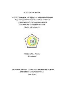 Purba, Yulia Azura (2023) PENENTUAN KADAR AIR, DENSITAS, VISKOSITAS, INDEKS BIAS MINYAK GORENG SEBELUM DAN SESUDAH PENGGORENGAN CORNDOG MOZARELLA YANG DIPERJUALBELIKAN DI PASAR MMTC KOTA MEDAN. Diploma thesis, Poltekkes Kemenkes Medan.