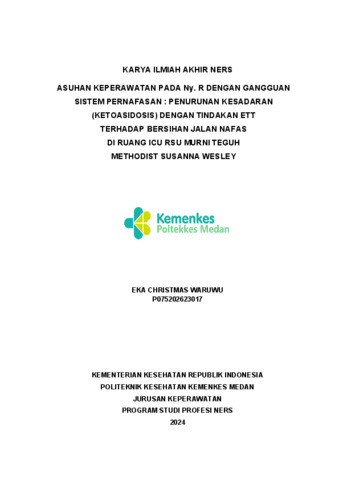 WARUWU, EKA CHRISTMAS (2024) ASUHAN KEPERAWATAN PADA Ny. R DENGAN GANGGUAN SISTEM PERNAFASAN : PENURUNAN KESADARAN (KETOASIDOSIS) DENGAN TINDAKAN ETT TERHADAP BERSIHAN JALAN NAFAS DI RUANG ICU RSU MURNI TEGUH METHODIST SUSANNA WESLEY. Diploma thesis, Poltekkes Kemnkes Medan.