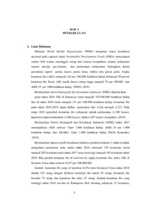 Menurut world health organization (WHO) pada tahun 2018 Angka Kematian Ibu (AKI) diseluruh dunia 216 per 100.000 Kelahiran Hidup (KH) setiap hari sekitar 830 wanita meninggal karena komplikasi kehamilan seperti: anemia, pre-eklamsi, dan perdarahan antepartum sedangkan dalam persalinan seperti partus macet, partus lama, infeksi dan gawat janin. AKB 3,1per 1.000 KH. Laporan Tugas Akhir (LTA) bersifat continuity care dalam bentuk asuhan kebidanan kepada ibu dan bayi mulai saat kehamilan, persalinan, nifas, bayi baru lahir, dan keluarga berencana dengan menggunakan pendekatan manajemen kebidanan. Untuk mencapai hal tersebut penulis mengambil dipraktek mandiri klinik sari sebagai salah satu lahan praktik yang telah memiliki Memorandum of Understanding (MOU) dengan Institusi Pendidikan D-III Kebidanan Poltekkes Kemenkes RI Medan sebagai lahan praktik.