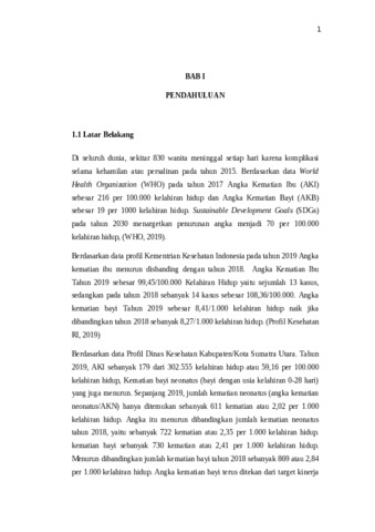 Berdasarkan data World Health Organization (WHO) pada tahun 2017 Angka Kematian Ibu (AKI) sebesar 216 per 100.000 kelahiran hidup dan Angka Kematian Bayi (AKB) sebesar 19 per 1000 kelahiran hidup. Sustainable Development Goals (SDGs) pada tahun 2030 menargetkan penurunan angka menjadi 70 per 100.000 kelahiran hidup. (WHO, 2019). Pada tahun 2018 Kementerian Kesehatan memiliki upaya percepatan penurunan AKI dengan menjamin agar setiap ibu mampu mengakses pelayanan kesehatan ibu berkualitas, yaitu dengan: (1) Pelayanan kesehatan ibu hamil, (2) Pertolongan persalinan oleh tenaga kesehatan terlatih di fasilitas pelayanan kesehatan, (3) Perawatan pasca persalinan bagi ibu dan bayi, (4) Perawatan khusus dan rujukan jika terjadi komplikasi, dan (5) Pelayanan keluarga berencana termasuk KB pasca persalinan. Gambaran upaya kesehatan ibu terdiri dari: (1) Pelayanan kesehatan pada ibu hamil, (2) Pelayanan imunisasi tetanus bagi wanita usia subur dan hamil, (3) Pelayanan kesehatan pada ibu bersalin, (4) Pelayanan kesehatan pada ibu nifas, (5) Puskesmas melaksanakan kelas ibu hamil, program perencanaan persalinan, dan pencegahan komplikasi (P4K), dan(6) Pelayanan kontrasepsi/KB.(Profil Kemenkes RI, 2018).