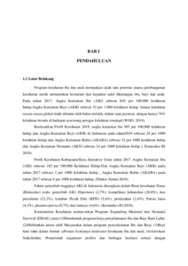 Angka Kematian Ibu dan Bayi di Indonesia masih merupakan masalah yang harus mendapat prioritas dengan jumlah AKI sebesar 305/100.000 KH dan AKB sebesar 24/1.000 KH. Salah satu upaya penurunan AKI dan AKB di Indonesia yaitu pelaksanaan asuhan dengan konsep continuity of care, yaitu pelayanan berkesinambungan kepada ibu sejak hamil, bersalin, nifas, dengan melakukan pencatatan dan pendokumentasian, yang mencakup informasi tentang kondisi dan perkembangan kesehatan reproduksi serta semua kegiatan yang dilakukan bidan dalam memberikan asuhan.