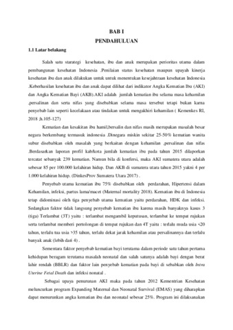 Berdasarkan Angka Kematian Ibu dan Bayi di Indonesia masih merupakan masalah yang harus mendapatkan prioritas dengan jumlah AKI sebesar 305/100.000 KH dan AKB sebesar 22,23/1.000 KH. Salah satu upaya penurunan AKI dan AKB di Indonesia yaitu pelaksanaan asuhan dengan konsep continuity of care, yaitu pelayanan berkesinambungan kepada ibu sejak hamil, bersalin, nifas, dengan melakukan pencatatan dan pendokumentasian, yang mencakup informasi tentang kondisi dan perkembangan kesehatan reproduksi serta semua kegiatan yang dilakukan bidan dalam memberikan asuhan.