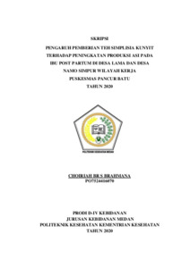 Brahmana, Choiriah BR S (2020) Pengaruh Pemberian Teh Simplisia Kunyit Terhadap Peningkatan Produksi Asi pada Ibu Post Partum Di Desa Lama dan Desa Namo Simpur Wilayah Kerja Puskesmas Pancur Batu Tahun 2020. Diploma thesis, Poltekkes Kemenkes Medan.