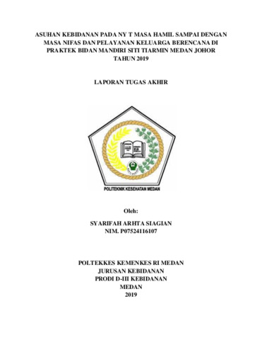 Siagian, Syarifah Artha (2019) Asuhan Kebidanan pada Ny T Masa Hamil Sampai dengan Masa Nifas dan Pelayanan Keluarga Berencana di Praktek Bidan Mandiri Siti Tiarmin Medan Johor Tahun 2019. Diploma thesis, Poltekkes Kemenkes Medan.
