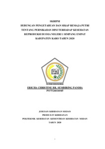 Pandia, Ericha Christine Br Sembiring (2020) Hubungan Pengetahuan dan Sikap Remaja Putri Tentang Pernikahan Usia Dini Terhadap Kesehatan Reproduksi di SMA Negeri 1 Simpang Empat Kabupaten Karo Tahun 2020. Diploma thesis, Poltekkes Kemenkes Medan.