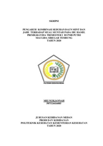 Nurjannah, Mei (2020) Pengaruh Kombinasi Seduhan Daun Mint dan Jahe Terhadap Mual Muntah pada Ibu Hamil Primigravida Trimester I di PMB Putri Maulida Siregar Tembung Tahun 2020. Diploma thesis, Poltekkes Kemenkes Medan.
