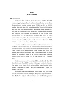 Di Indonesia menurut SUPAS pada tahun 2015, AKI mencapai 305/100.000 KH dari 359/100.000 KH pada tahun 2012 dan AKB mencapai 23/1.000 KH. Kematian ibu disebabkan oleh penyebab langsung obstetri yang hipertensi pada kehamilan 32% komplikasi puerperinium 31 % perdarahan postpartum 20%, lain lain 7% abortus 4% perdarahan antepartum 3% kelainan amniom 2% dan partus lama 1%. Salah satu upaya untuk penurunan AKI adalah dengan asuhan ANC secara Continuity of Care