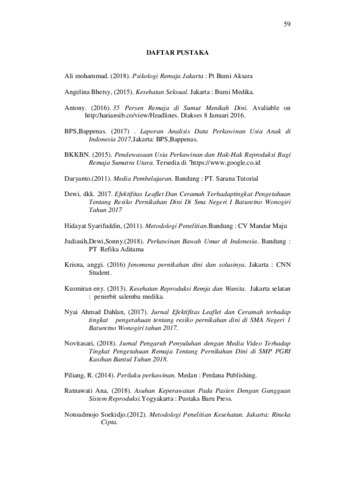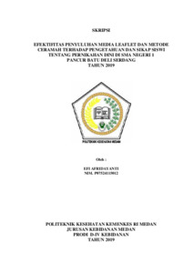 Afridayanti, Efi (2019) Efektifitas Penyuluhan Media Leaflet dan Metode Ceramah Terhadap Pengetahuan dan Sikap Siswi tentang Pernikahan Dini di SMA Negeri 1 Pancur Batu Deli Serdang Tahun 2019. Diploma thesis, Poltekkes Kemenkes Medan.