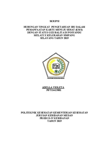 Violeta, Adella (2019) Hubungan Tingkat Pengetahuan Ibu dalam Pemanfaatan Kartu Menuju Sehat (Kms) dengan Status Gizi Balita di Posyandu Melati X Kelurahan Simpang Selayang Tahun 2019. Diploma thesis, Poltekkes Kemenkes Medan.